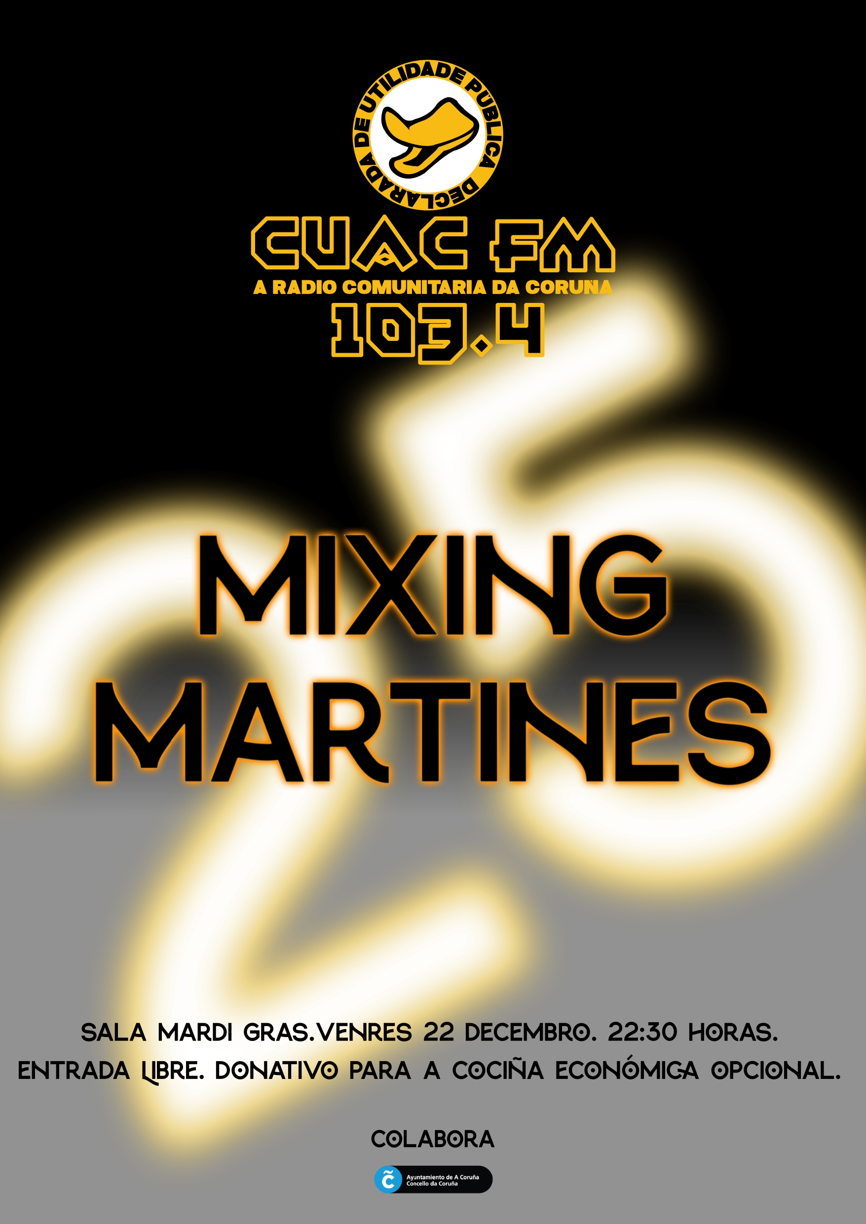 Este venres chega á Sala Mardi Gras o quinto concerto conmemorativo dos XXV anos do Concurso de Bandas e solistas de CUAC FM. Mixing Martines con Bonham como cabeza visible do proxecto e entrada libre. Ainda que xa sabes que podes doar o que desexes e irá íntegramente para a Cocina Económica Coruña A apertura de portas será ás 22:30 e o inicio do concerto ás 23:00 horas.