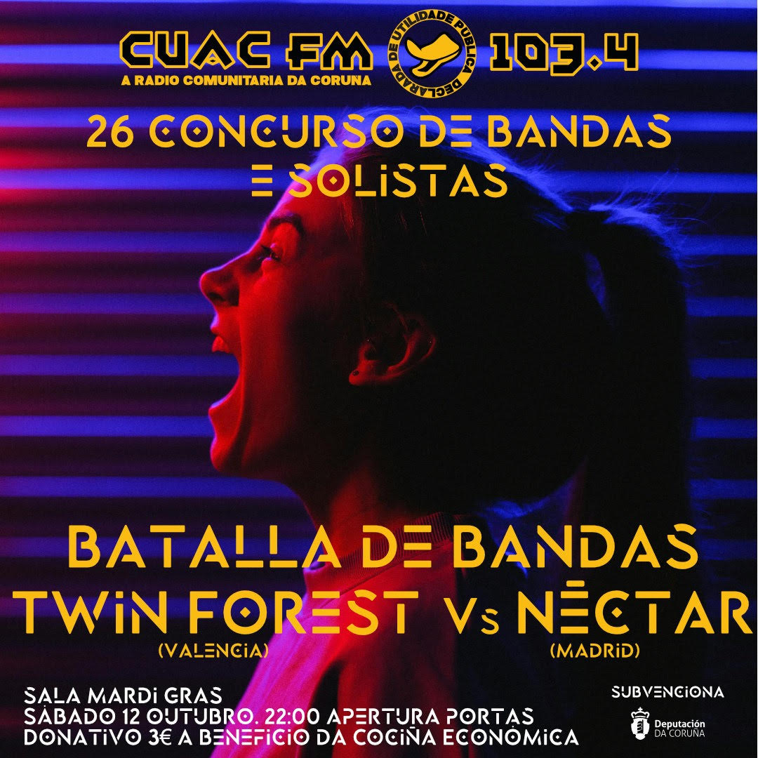 CUAC FM convocou este ano o seu XXVI Concurso de Bandas e solistas. A batalla de bandas celébrase o sábado 12 de outubre, un ano máis na Sala Mardi Gras. Actuarán Néctar, de Madrid e Twin Forest desde Valencia. No descanso entre bandas recibirán o premio á Mellor Banda Local Bad Whiskey. Os premios son de 1000 euros para a banda gañadora e de 900, tanto para a segunda como para a mellor banda local. Unha noite de rock, rap e outros estilos que misturan as duas bandas finalistas elexidas polo xurado entre as 150 bandas recibidas.