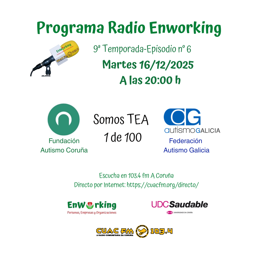 Escuchamos hoy a M. José Alvarez Folgar, Presidenta de la Fundación Autismo Coruña y a Cristina Couto Pena, coordinadora de programas de la Federación Autismo Galicia. También contamos con Salvador Lorenzo, autor de la canción TEAmo, acompañado de Zeltia, vocalista, precisosa canción que escuchamos en nuestra habitual pausa musical.